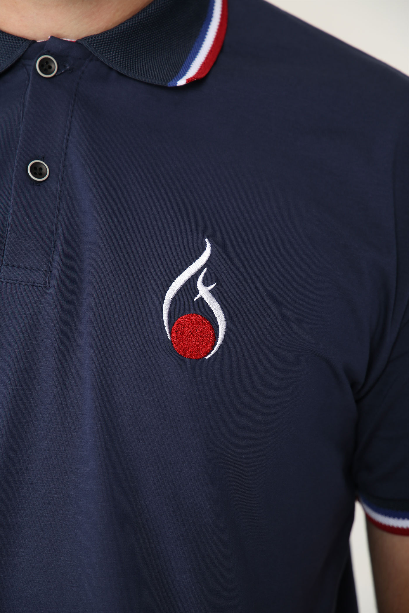 Men’s navy stretch polo—contrast-tipped collar/cuffs, embroidered chest logo.