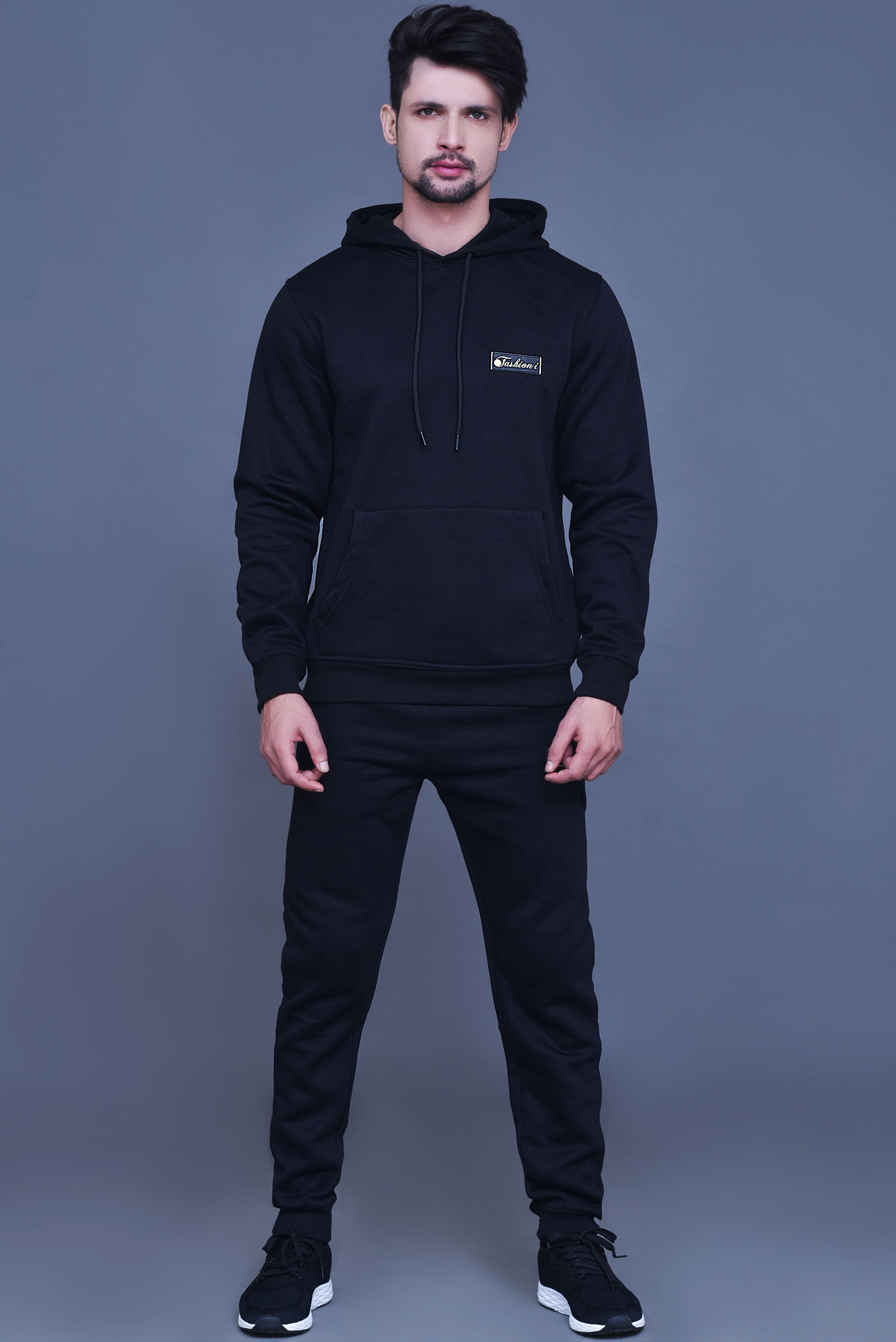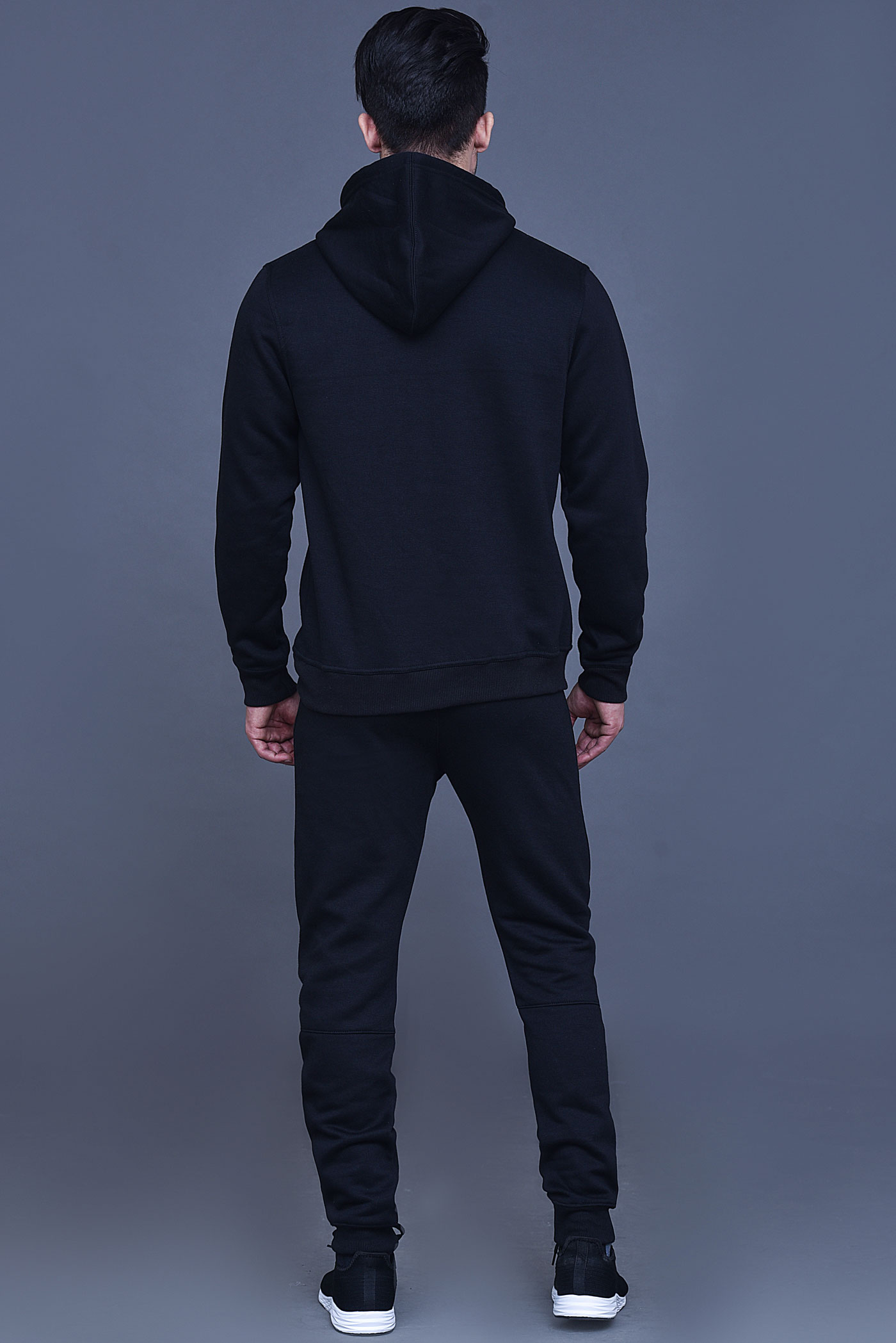 Men’s black hooded tracksuit—soft fleece, kangaroo-pocket hoodie, tapered joggers.